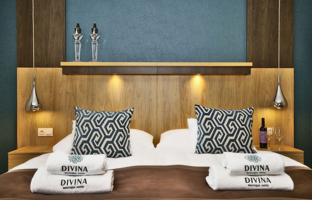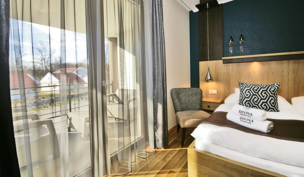 „Világos párduc”, avagy a Divina Hotel egyik leginkább napfényes, első emeleti, dupla teraszos szobája. Délnyugati utcafronti fekvése és a helyiség világos árnyalatokat felvonultató berendezése garantáltan a legjobb választás azoknak, akik pihenésük során előnyben részesítik a napfényt és pezsgést.