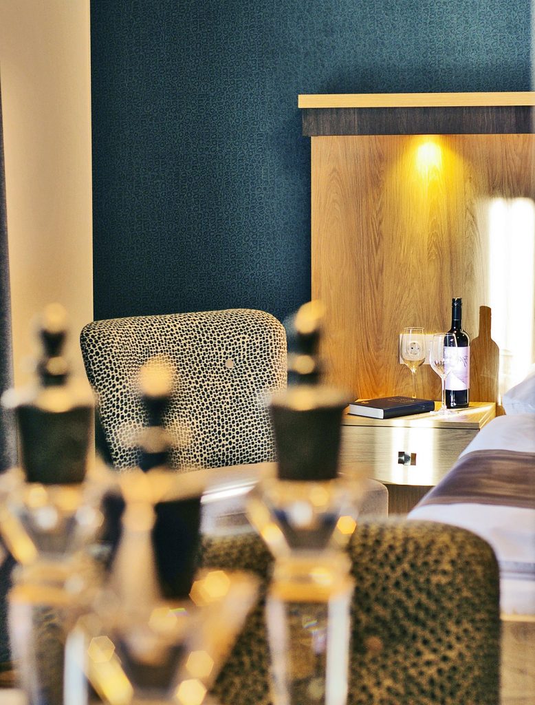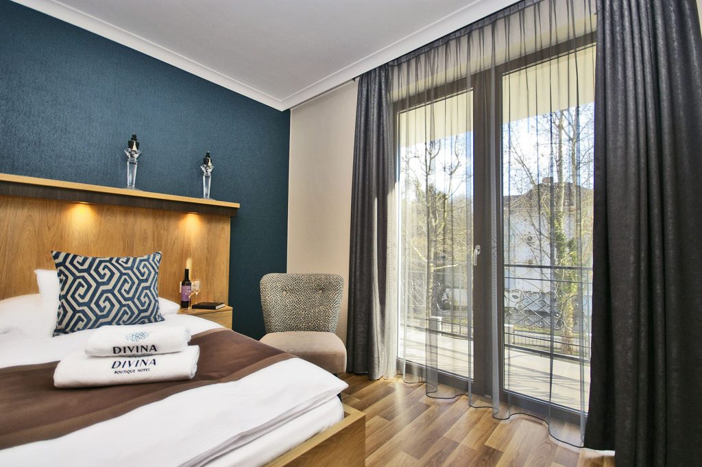 A Divina „klasszikus” párducmintázatú tapétája díszíti ezt a szobát, amely harmonikusan illeszkedik a szürke tónusú függönyhöz és a szürke-kék mintázatú székekhez. Teraszáról szállodánk déli oldalán végigfutó gyönyörű fasora, valamint az udvar és az étterem kerti részlege látható, így ezt a szobát elsősorban azon vendégeinknek ajánljuk, akik egy világos, nem közvetlen utcafronti helyiségben pihennék ki fáradalmaikat.